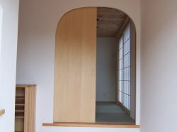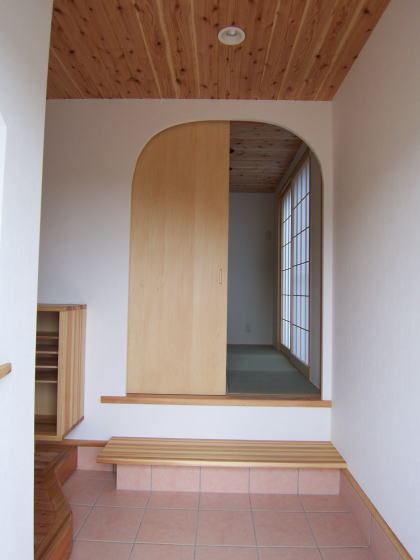 内観3: 玄関かまち、式台、下駄箱など杉積層材で製作 やわらかい光が部屋を包みます。